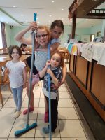 In der Früh frühstückten alle miteinander. Nachdem die vielen Schlafsäcke und Taschen wieder gepackt waren, ging es zum letzten Mal an die Geräte. Die Turnerinnen und ihre Trainerinnen strengten sich im Training noch einmal richtig an. Einige der Mädchen konnten in diesen drei Tagen neue Elemente erlernen und alle schafften es, ihre Übungen noch sauberer zu turnen. Den Abschluss unseres Camps bildete ein Ausflug zur nahegelegenen Eisdiele. Auch unsere verletzte Turnerin ließen wir nicht zuhause. Sie nahm im Bollerwagen Platz und war auf unserer kurzen Wanderung mit von der Partie. Bei schönem Wetter freute sich jeder über sein Eis und war froh, beim Camp dabei gewesen zu sein.
